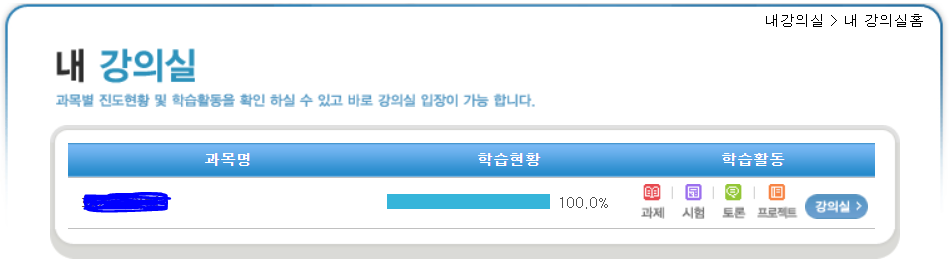 학습현황이 나오고 학습활동칸들이 있습니다~ 저는 열심히 들어서 학습현황 100% 찍었답니다 ㅎㅎ