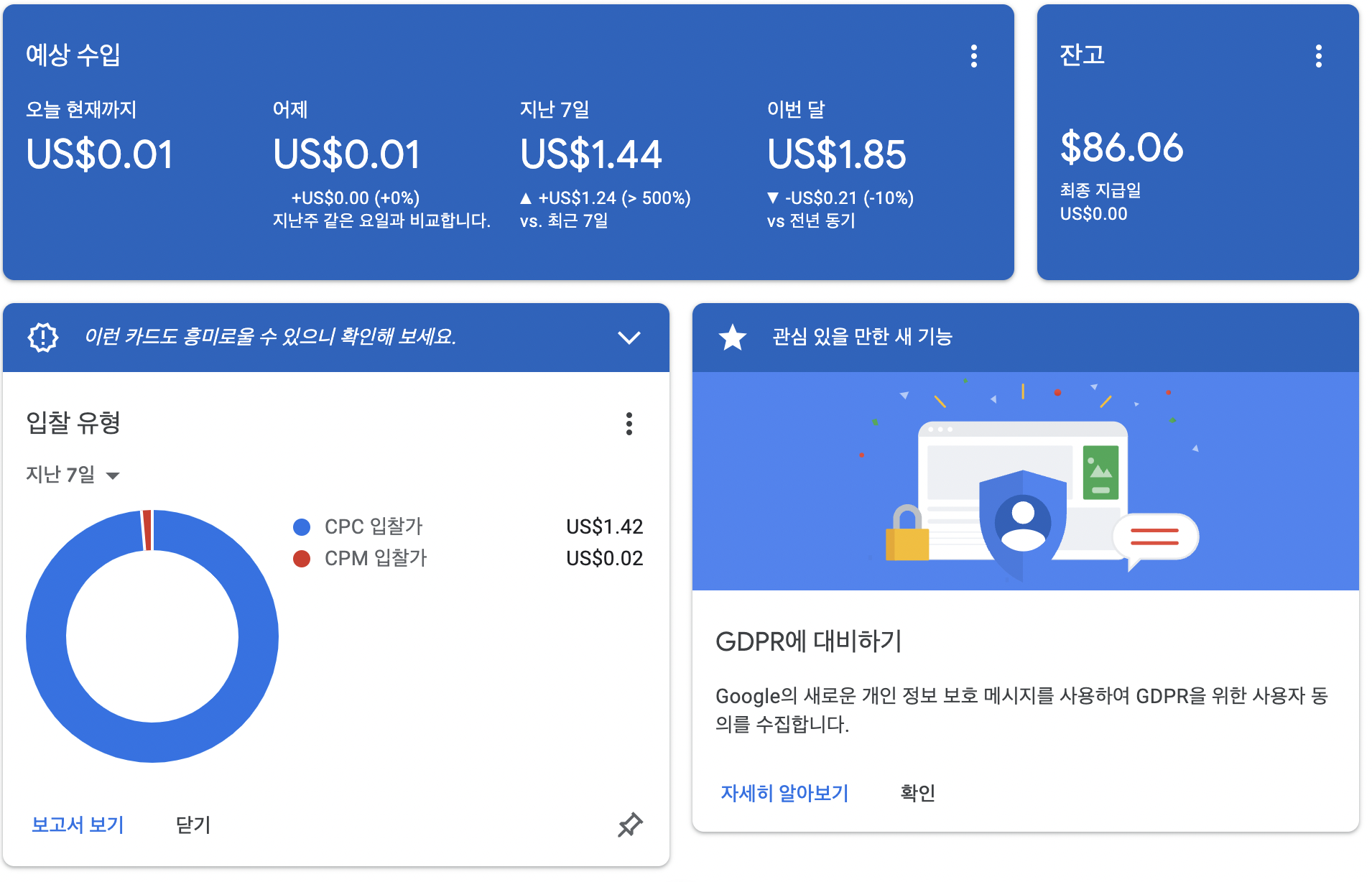 이것은 구글 애드센스에서 보실 수 있는 화면입니다.